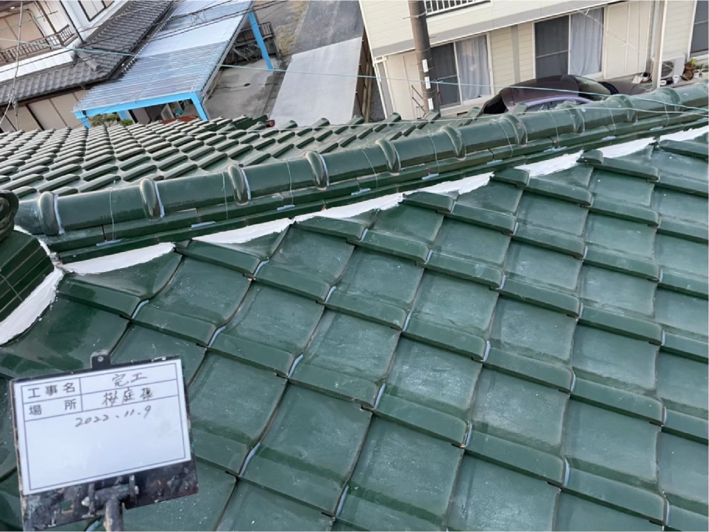 鬼瓦がついている場合はここも漆喰で固定し直し、全体がまっすぐになっているか確認して完了です。歪みが無くなった棟は見た目にも気持ちがいい仕上がりです。