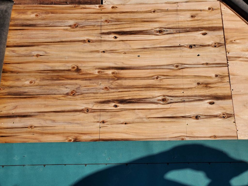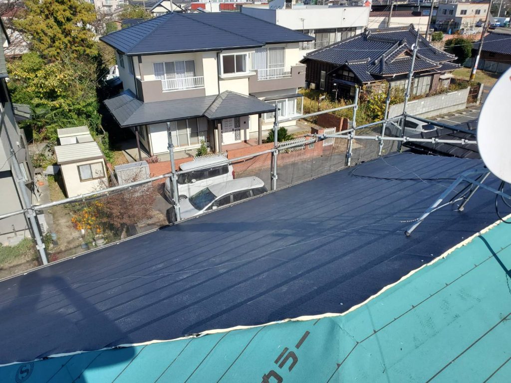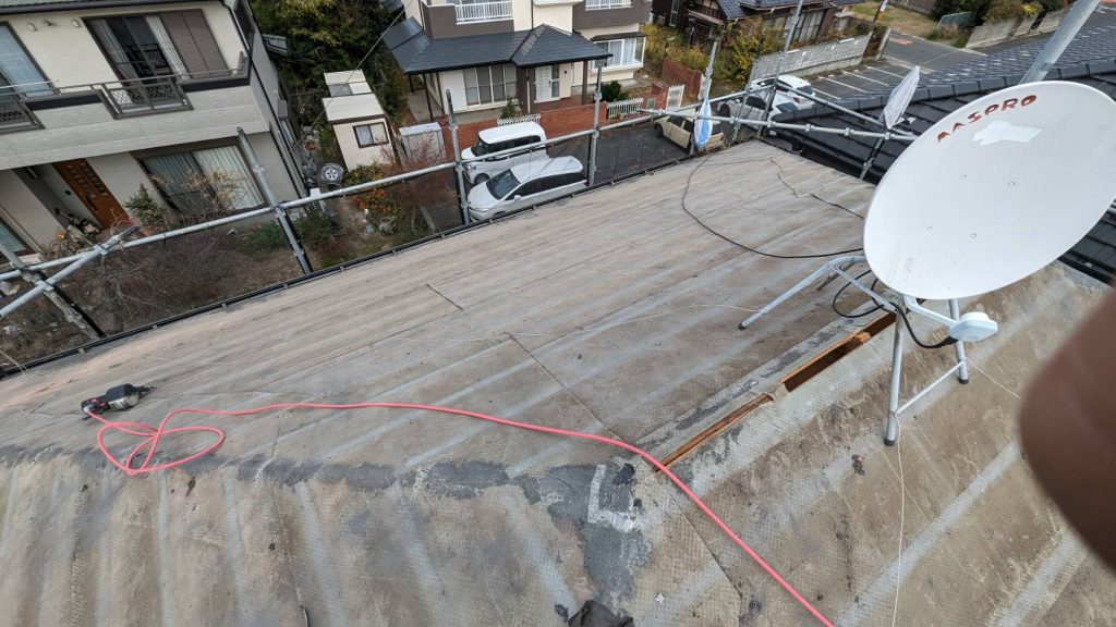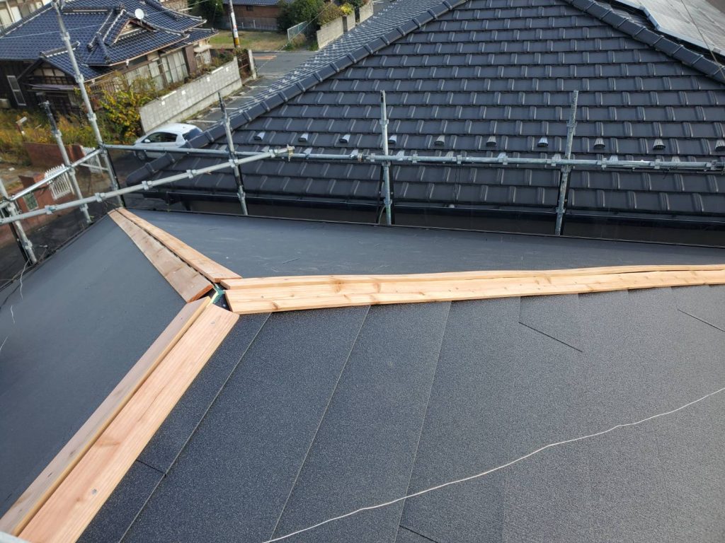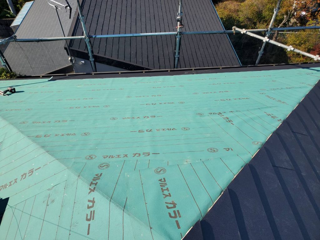 雨漏り箇所の下地を部分的に下地補修をしてから葺き替え。