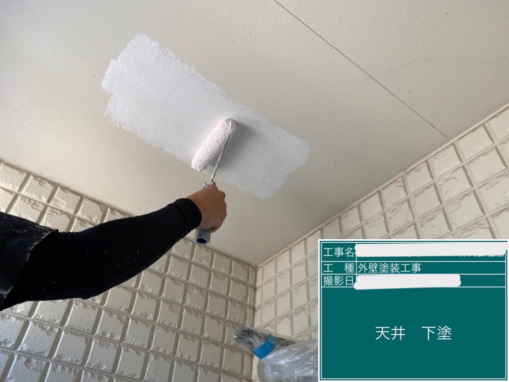 軒天井塗装になります。こちらも2層工程になっております。専用の塗料を使用します。